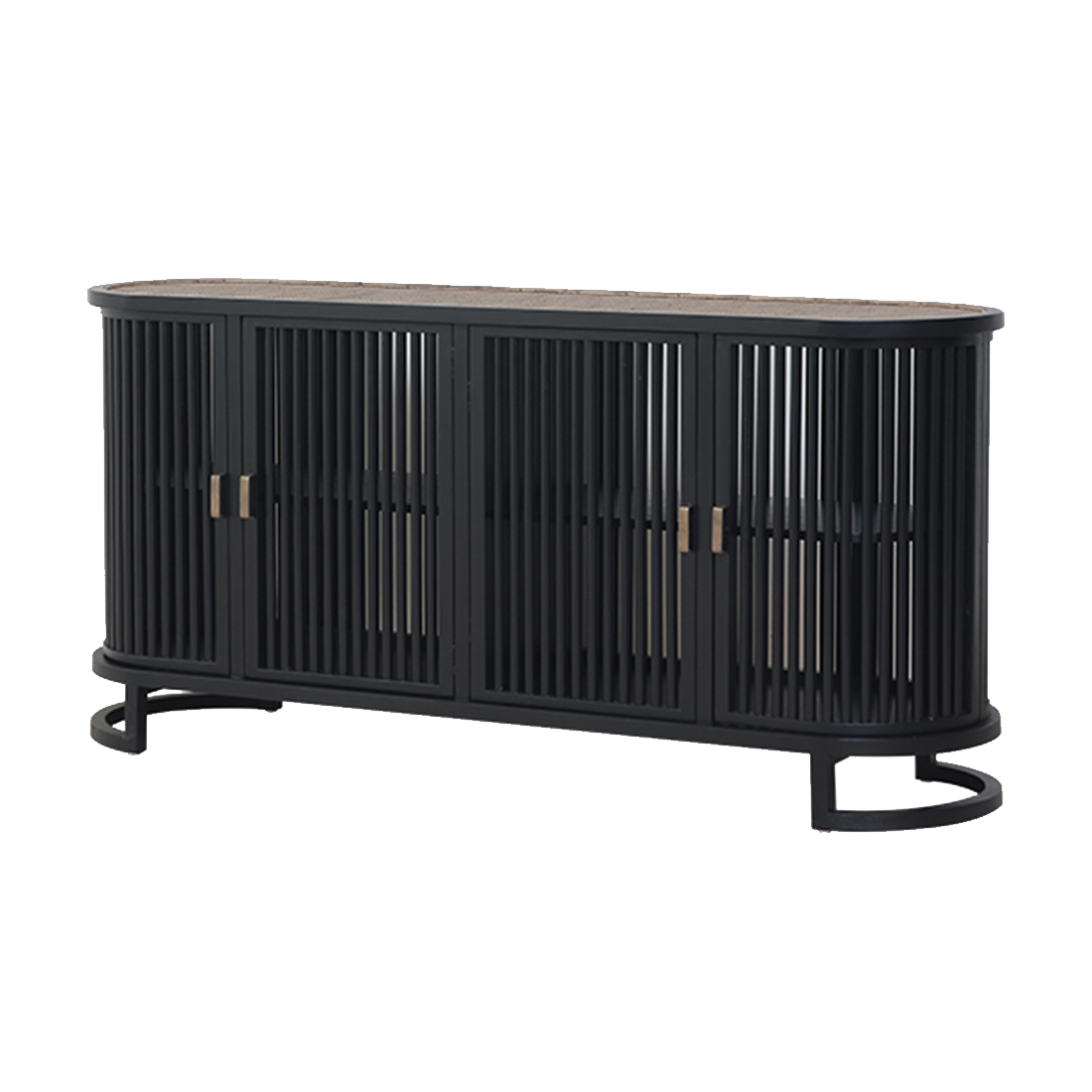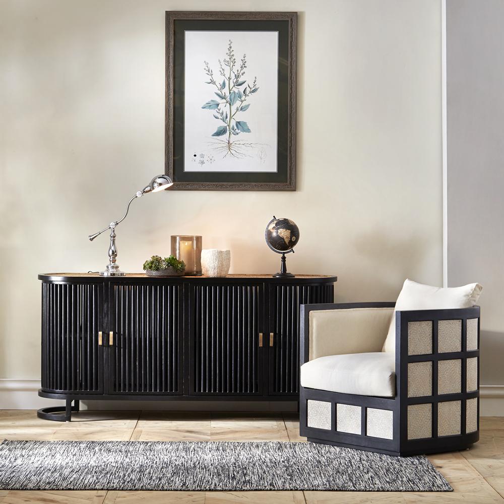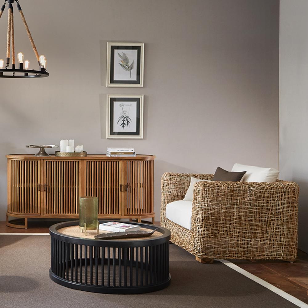 This elegant, curved hardwood frame is sure to be a conversation piece. Curved and polished, the rattan poles add character to the design, making this piece unique and edgy.