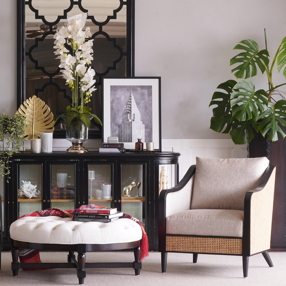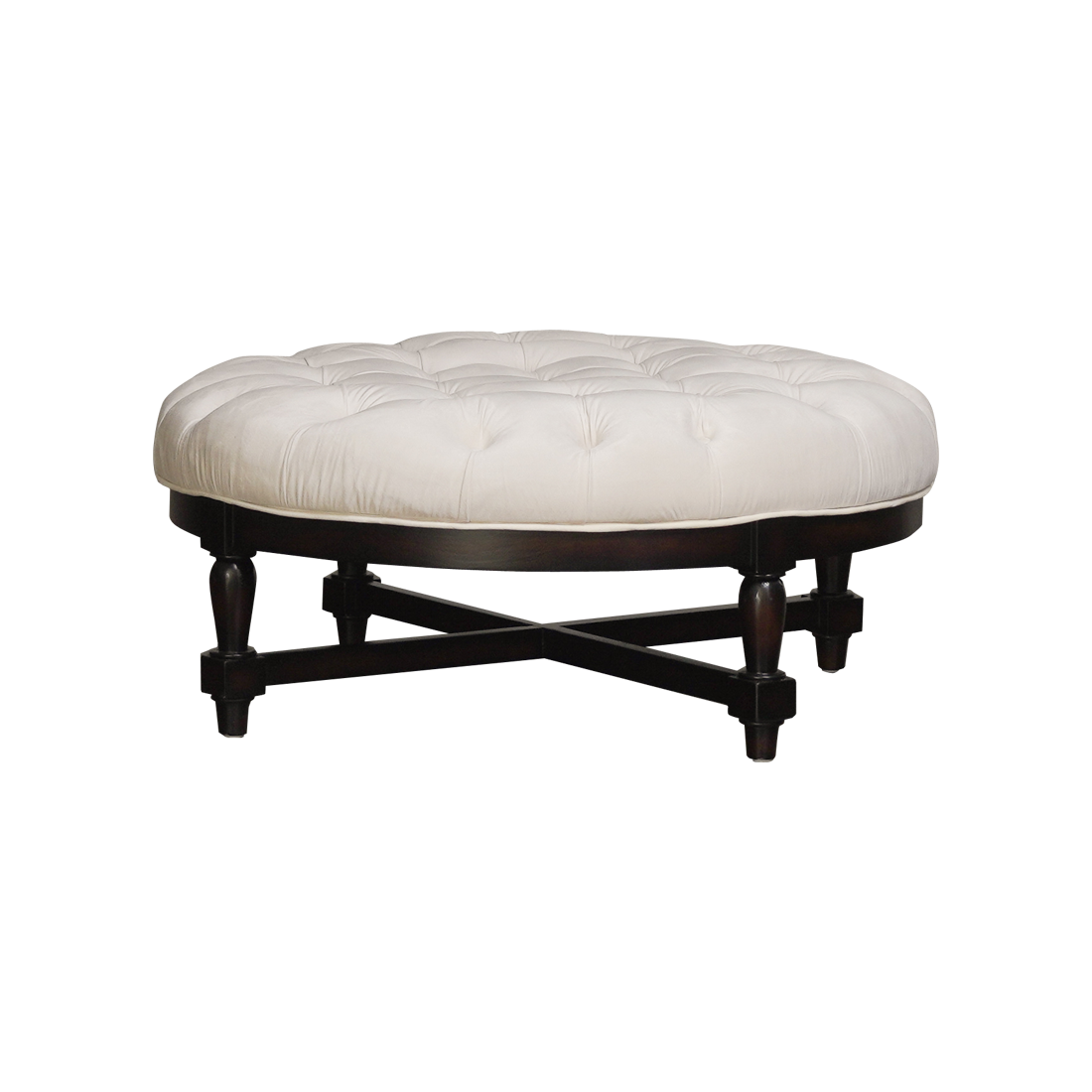 A round tufted cushion with a mahogany solid wood frame, a classical design for your furnishing experience. Madras is perfect for completing your living collection.