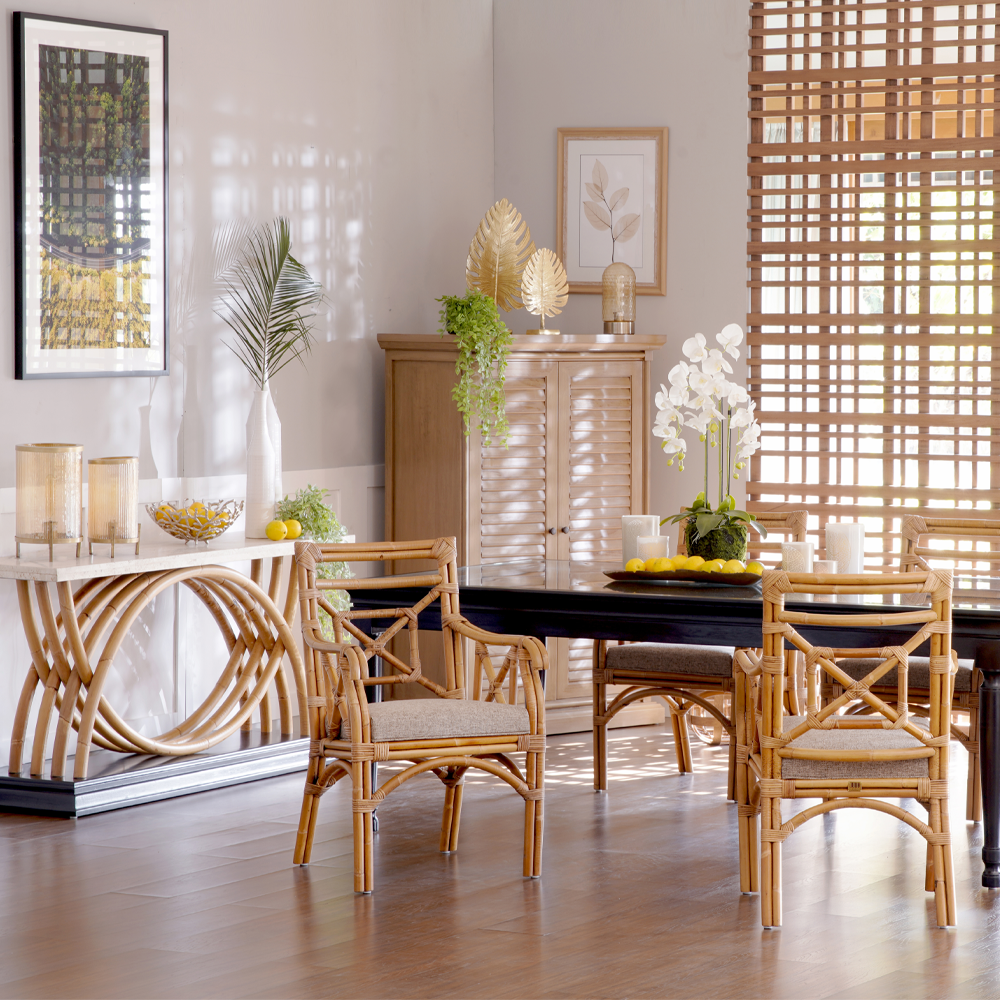 A modern console table made of eco-friendly manau rattan cane and elegant marble stone. The unique curvy shape is a perfect addition to any living room.